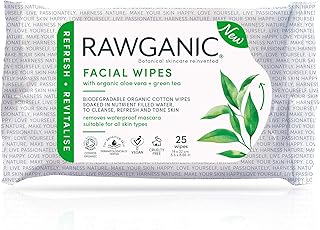 RAWGANIC Lingettes Démaquillantes Bio | Visage, Yeux, Lèvres | Coton Bio Biodégradable | Aloe Vera Thé Vert | Sans parfum (Paquet de 25 lingettes)
